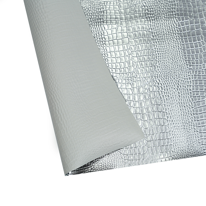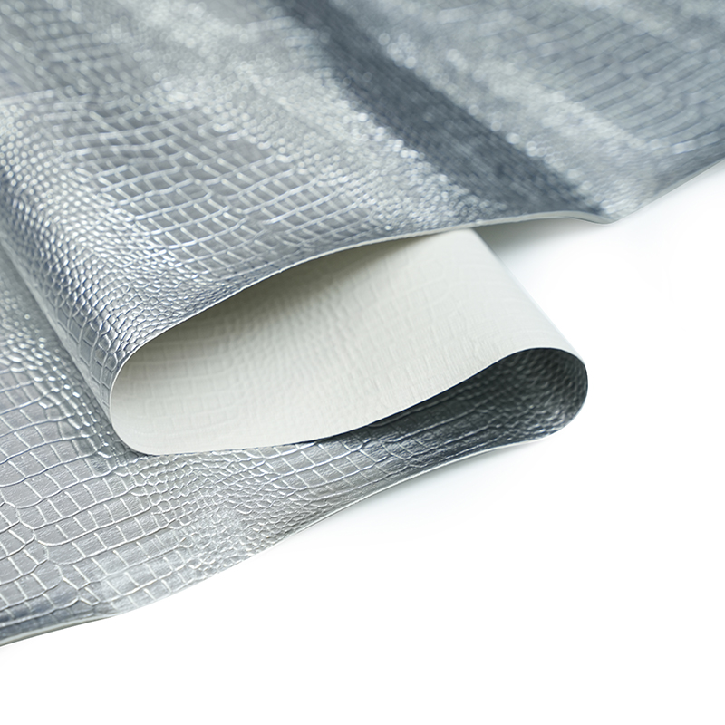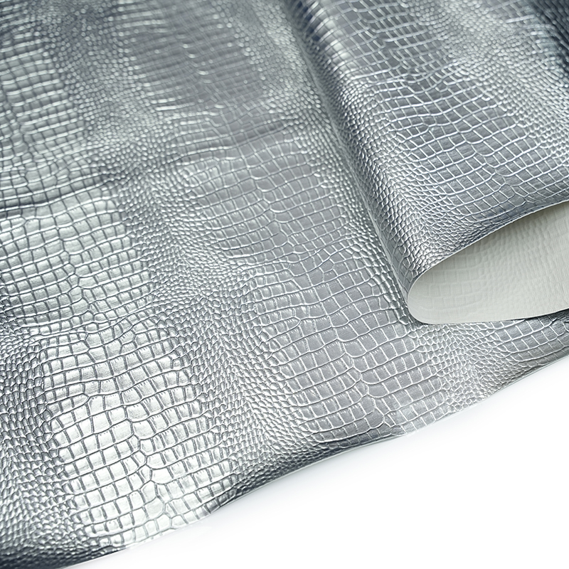 Is é an ghné shainiúil den leathar saorga seo a dath airgid sleek agus radanta. Cuireann an bailchríoch mhiotalach cáilíocht lustrous leis, rud a chruthaíonn dromchla machnamhach a ghabhtar agus a imríonn le solas. Is é an toradh atá air seo ná cuma iontach agus nua -aimseartha a spreagann aeistéitic fhoriomlán na málaí gan stró.